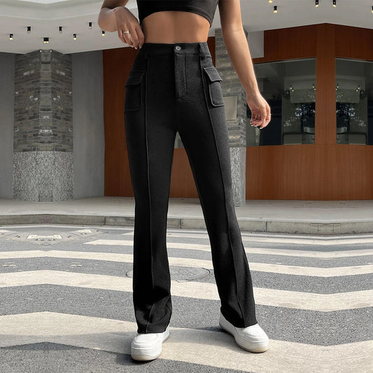 Women Clothing Street Pocket Slim Solid Color Stretch Bootcut Trousers Casual Trousers